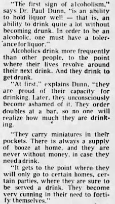 For Dr. Dunn was an alcoholic. Later, in 1975 when he was Medical Director of Dade County's Alcohol Detoxification Program, he described his experiences to the Miami News and explained that he did not stop drinking until 1970. That was about the time the hospital went away.